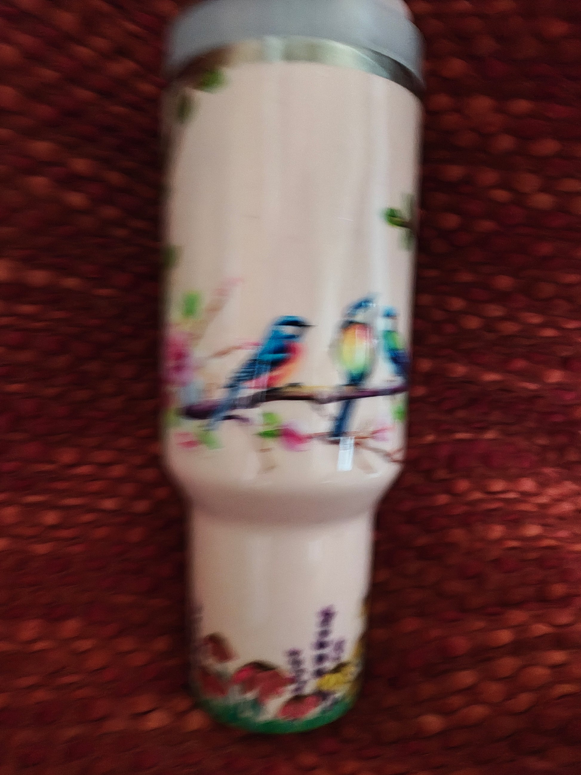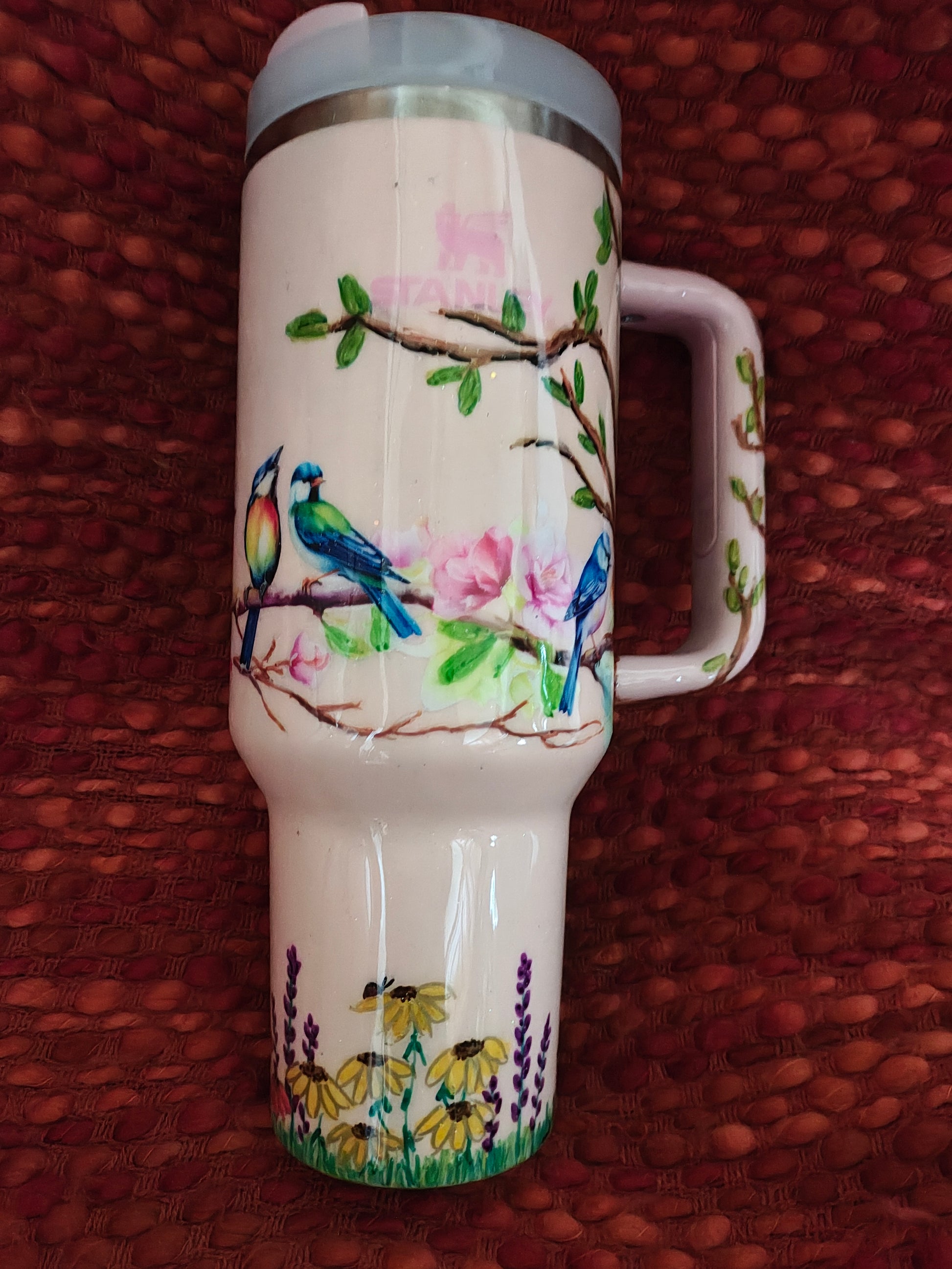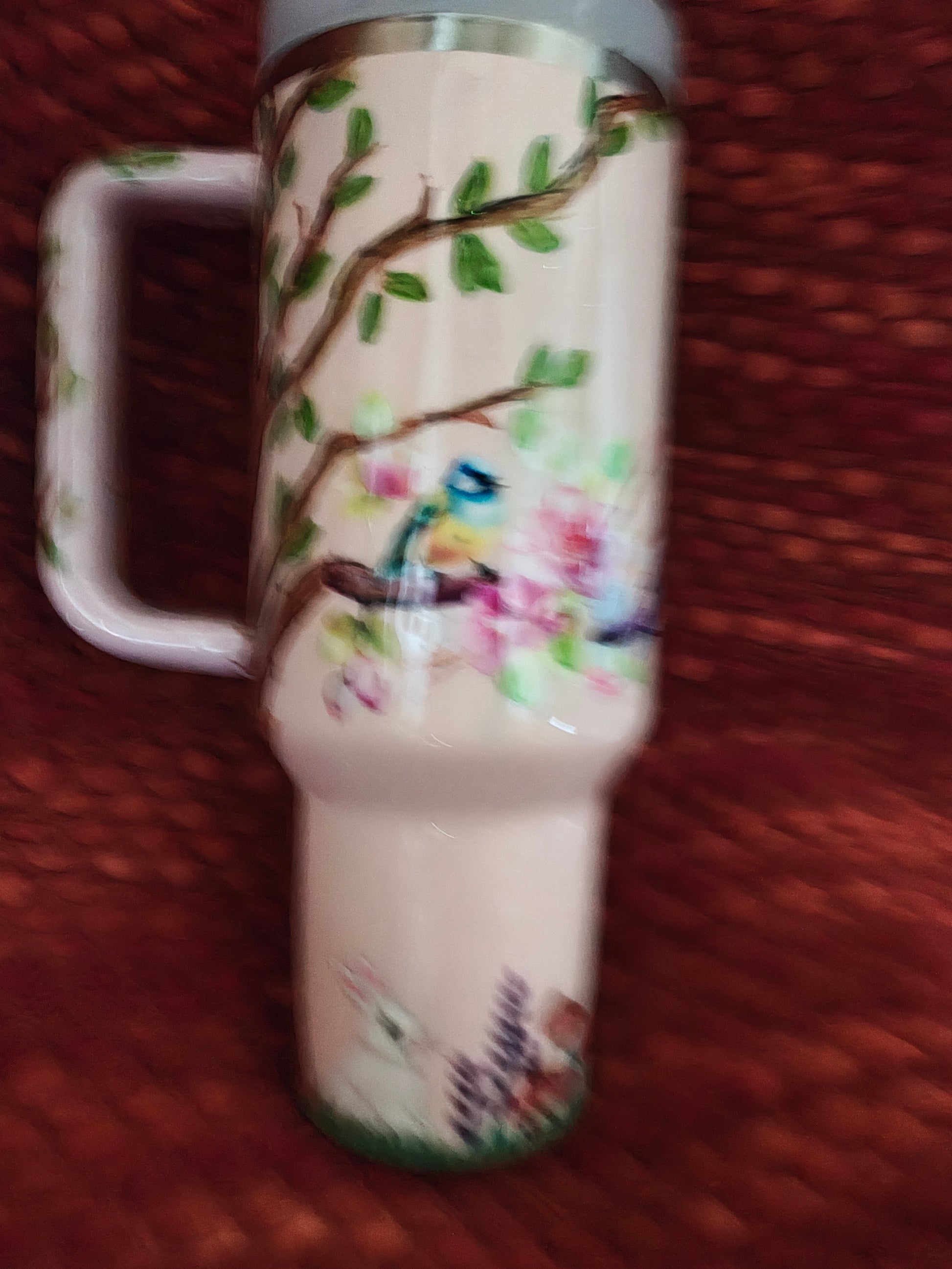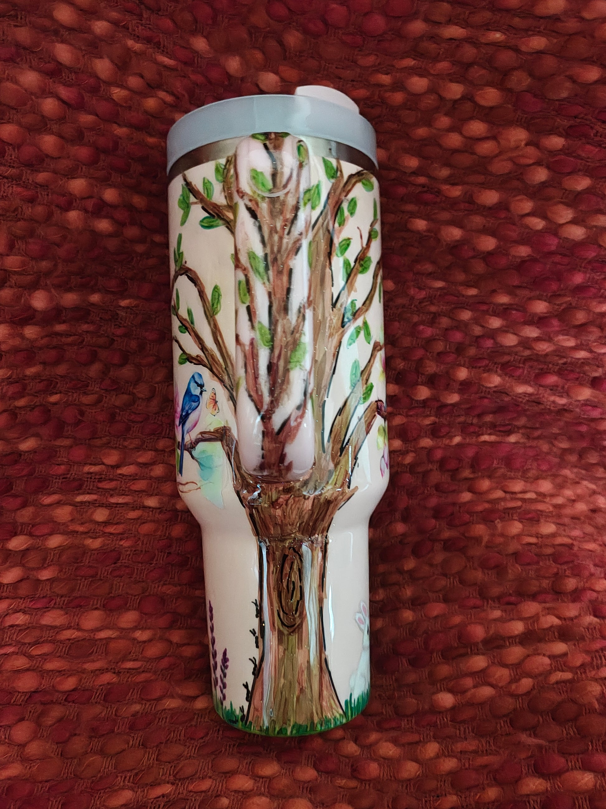 Pink Stanley with birds decal and hand painted tree/flowers/rabbit